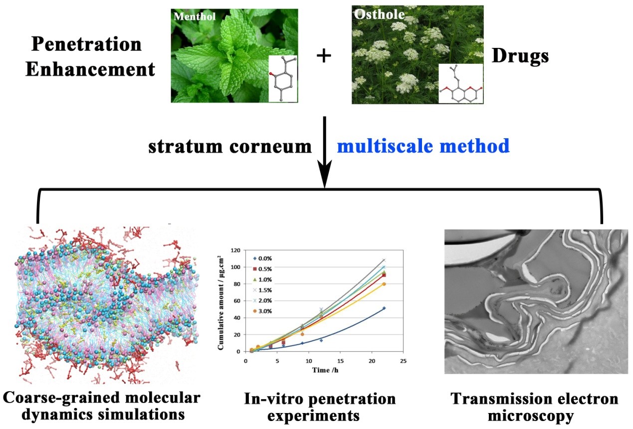 近日,我中心杨树芳同学于Journal of Chemical Information and Modeling杂志发表了题为“A Multiscale Study on the Penetration Enhancement Mechanism of Menthol to Osthole”的文章。文章中,作者基于“微观探索,宏观验证”的研究思路,首次结合多尺度方法(粗粒化分子动力学模拟、体外皮肤渗透实验以及透射电子显微法)揭示了薄荷醇对蛇床子素的促透机理。该项研究为探索中药经皮给药协同作用提供了更为先进、高效的方法,对于深入研究中药促透剂的促透机理及规律具有重要意义。Journal of Chemical Information and Modeling主要报导化学信息学与分子模拟领域的前沿方法及其重要应用,2015年的影响因子为3. 657。